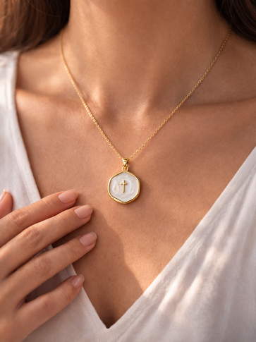 Gold Cross on Mother of Pearl Necklace
